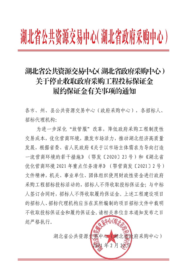 湖北省公共資源交易中心(湖北省政府采購中心)關(guān)于停止收取政府采購工程投標保證金履約保證金有關(guān)事項的通知
